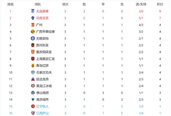 前三轮结束,排名前两的是两支晋级马队。大连英博接班解散的大连人,这样的成绩是合理的;云南玉昆已经有了野心,赛季初的投入肉眼可见。遗憾的是,他们没能签下特谢拉。幸运的是,其他外援目前表现良好。