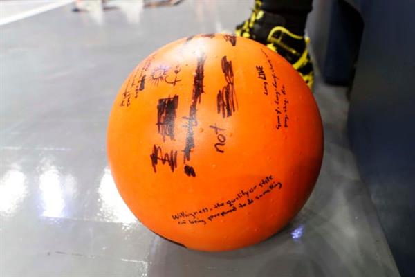 这颗加重的特殊球,已经陪 Rose 走过好几个城市,芝加哥、纽约、明尼苏达、克里夫兰、底特律到现在的曼菲斯,Rose 几乎随身携带,到了一个新的地方,Rose 就会在上面写上一些话,赋予它明确的意义。