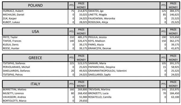 男子选手以希腊的Tsitsipas最高,女子选手则是美国的Pegula最高,都拿到了大约五十二万多美金的奖金,这个金额大约等於ATP 500赛事以及WTA 1000 (Non-Mandatory)等级赛事冠军的奖金,也算是收获颇丰盛。