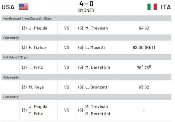 5. 决赛对决,美国率先前面四点全部拿下,尤其在Taylor Fritz两盘抢七击败Matteo Berrettini之後就率先抢下三胜,Madison Keys接着又再女单拿下一点。最後混双未举行,就以4-0击败义大利,拿下第一届联合盃的冠军。