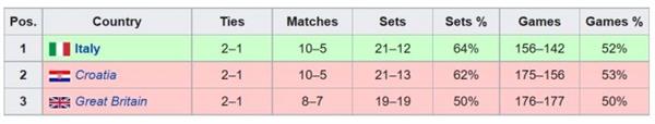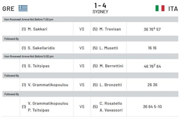 义大利则是4-1击败热门的希腊队,进入最後四强。Maria Sakkari在第一点意外输给义大利左手持拍的Trevisan,第二点又让Musetti拿下;虽然第三点靠着Tsitsipas扳回一城,但是後面两点後继无力,让义大利进入决赛。