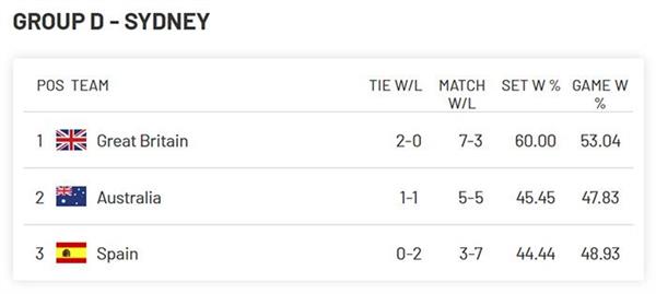 D组的英国队表现出色,硬是把地主澳洲队以及拥有Rafael Nadal领军的西班牙队给强压下去,拿到分组冠军。