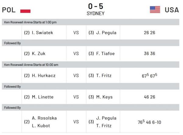 4. 四强对决,胜方进入决赛。最後美国五点全胜,击败波兰,进入决赛。尤其第一点Jessica Pegula发挥相当出色,击败现任球后Iga Swiatek,让美国队拔得头筹,後面Tiafoe跟Fritz又陆续击败对手,奠定胜积,打入最後的决赛。