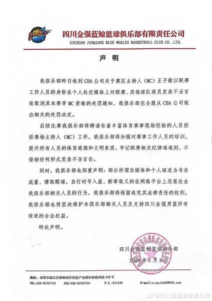 01月03日讯 四川男篮回应球队前MC王子敬被取消本赛季工作资格一事,俱乐部完全服从CBA公司的处罚决定,后续将聘请有丰富体育赛事现场经验的人员担任赛场主持人(MC)工作。