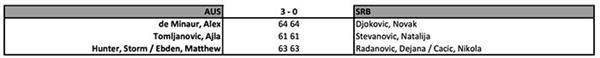 八强赛全部集中到雪梨。澳洲队横扫塞尔维亚,Djokovic在有伤的状态下第一点单打输球,後面就没有反败为胜的机会了。