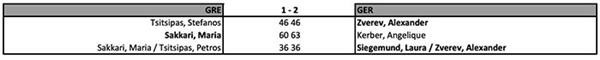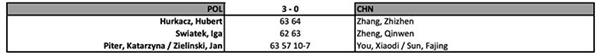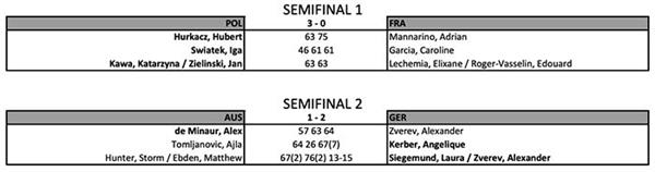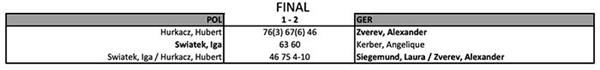 决赛女单先上场,球后Iga Swiatek毫无悬念直落二拿下首胜。Hubert Hurkacz对上Alexander Zverev,在第二盘的抢七中Hurkacz率先以6-4拿到两个赛末点,也是冠军点,最後却是让Zverev连拿四分,抢下第二盘。混双比赛双方也是激战到第三盘才由德国队拿下,奇蹟式地赢得冠军。