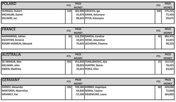 联合盃赛事是ATP及WTA底下的正式比赛,单打交手将会纳入正式的纪录当中,而且也有积分,混双则是只有奖金没有积分。最终Iga Swiatek从小组预赛到决赛,五场单打全胜,也只在对上法国的Carolien Garcia的时候掉过一盘,表现相当抢眼,最终他拿下五百分的积分,奖金则是超过七十七万美金,位居所有选手之上。