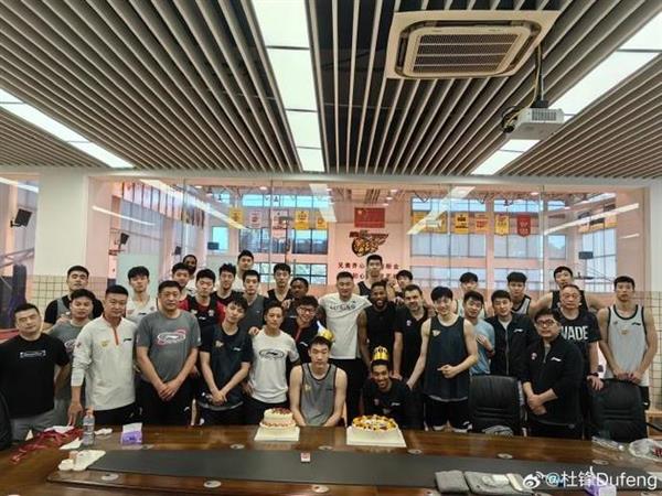 现场直播吧1月10日讯今天,广东男篮主教练杜锋更新了个人微博,晒出了球队庆祝赵戌宏、沃特斯生日的照片。