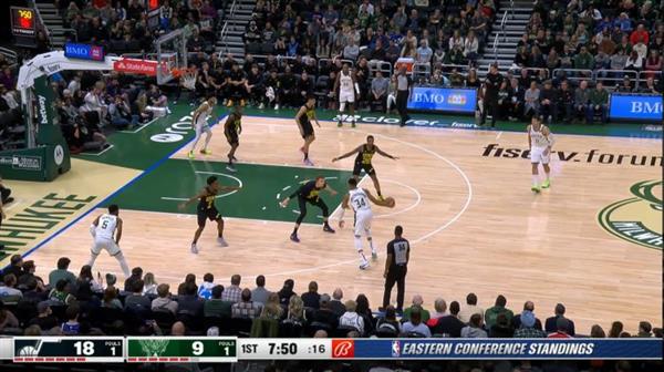 从这个画面可以看到这次进攻由Giannis 从弧顶发动,爵士看到後可以说几乎是四名防守者要准备上来去夹掉Giannis 的球,同时Giannis 本身虽然有在这一两年内开发一定水准的传球能力,但是这不代表他能够有能力可以在这麽短的时间内就找到空档的队友,同样的爵士队这边的几名防守球员在身体碰撞方面都给足,因此也没有给Giannis 太多机会去决策。