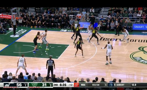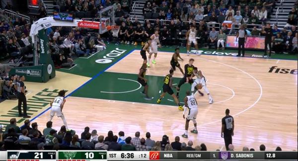 上图会是笔者认为爵士队在上半场做最好的一个部分,那就是在这进攻发起点其实是Beasley在轴区的位置寻找到Giannis 的要位以後马上将球交给他让他去从轴区的位子发动进攻,但是与过往不同的是同样在上去包夹Giannis 之时,爵士的球员其实是不断的将Giannis 给往外推出去,直接的将他给挤到三分线外,完全的破坏了公鹿队的进攻,同时爵士队在弱侧的地方虽然是完全方掉公鹿队射手AJ Green的,而篮下的Lopez也是原本守底角的Olynyk给换出来的,即使最终Giannis 依旧把球塞给底角的Green,但最终因为过多人上来包夹导致传球没有办法很精准得传给队友,最终爵士也可以不及不许的在包夹後再次回到原本的对位球员,这也就是为甚麽本场比赛公鹿队仅仅只能拿到46分的原因之一了。