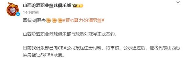 山西男篮正式宣布:“山西汾酒职业篮球俱乐部正式与球员刘冠岑签约。目前,我们的俱乐部已经向CBA公司提交了注册材料。经过审核和宣传,他将代表山西汾酒男篮参加CBA联赛。”从山西男篮的赛程来看,刘冠岑将在第二阶段回归首秀,最快将在下一场对阵山东男篮的比赛中回归。