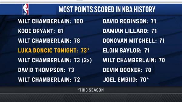 目前NBA曾得过至少73分的球员一共有四位,分别是Wilt Chamberlain、Kobe Bryant、David Thompson,以及今日的主角Doncic。
