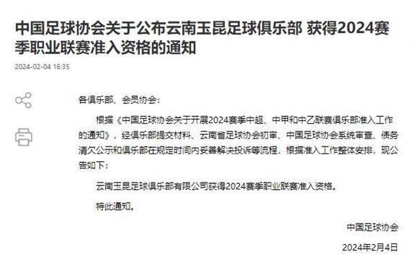 02月04日讯据足协官方消息,中乙球队云南玉昆获得2024赛季职业联赛准入资格。