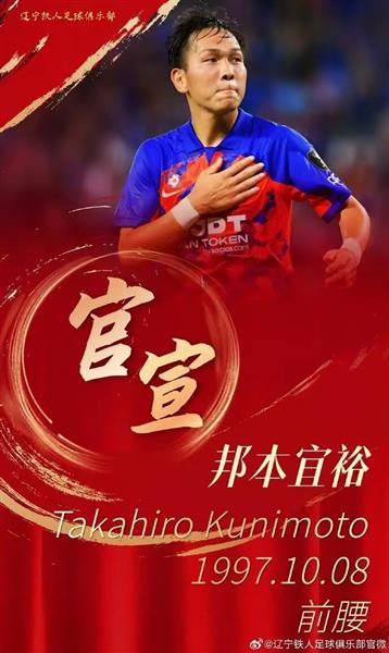 辽宁铁人足球俱乐部官方于2月10日宣布,日本前腰邦本宜裕已正式加盟球队。