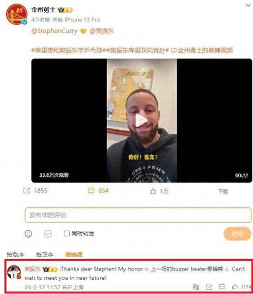 樊振东回复库里:上一场压哨绝杀泰裤辣!等不及和你见面