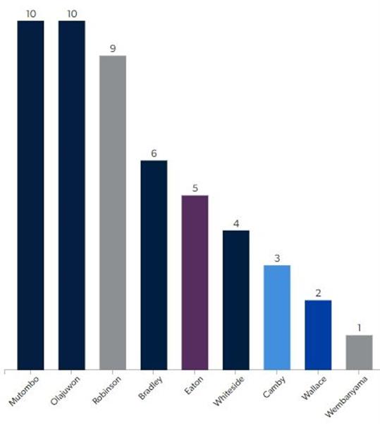 先不看其他的数据,光要单场10次阻攻有多困难呢?近10年包含Wembanyama这次只出现了8次单场10阻攻的纪录,而上一次出现是2021年的Clint Capela。