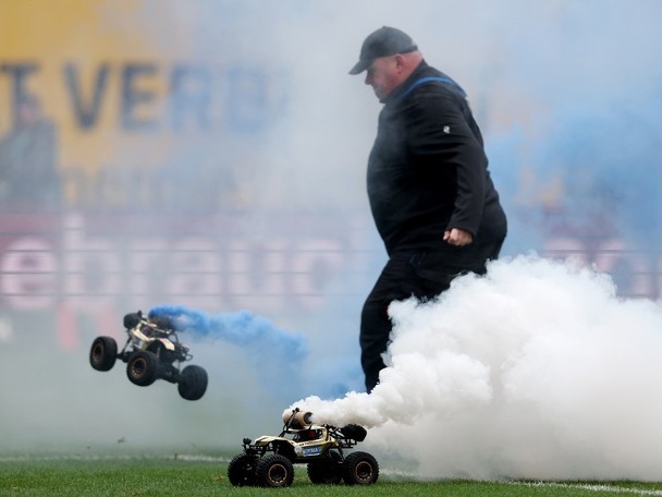 最抢镜一幕出现喺德乙罗斯托克对汉堡,有人出动遥控车,载住「烟雾弹」冲入球场,令球场烟雾迷漫,保安人员追住遥控车,并出脚踢想踢走部车,却唔成功,搞到非常狼狈。如果当局未能满足球迷诉求,恐怕嚟紧德国波将会出现更多混乱场面。