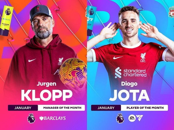 英超公布1月份各大最佳奖项,利物浦成为大赢家,主帅高普当选最佳领队,亦系呢位德国名帅相隔近3年,再获此殊荣。至於前锋迪亚高祖达当选最佳球员,亦系呢位葡萄牙国脚首次夺得呢个奖项。