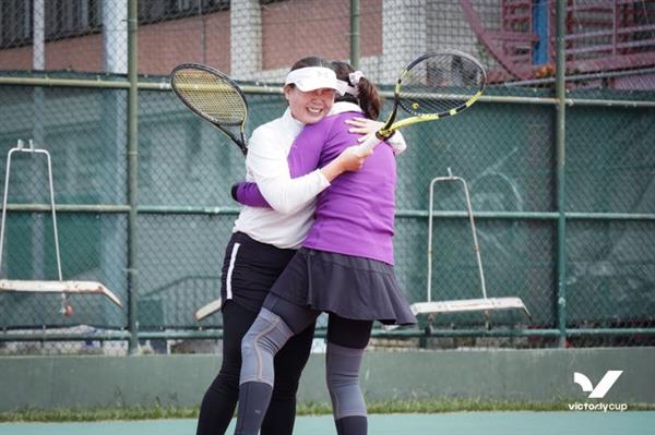 45岁组女双选手得分後兴奋庆祝