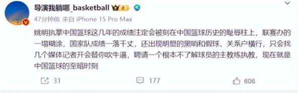 客场输给了88年来从未输给过的日本,不仅是普通球迷,媒体人也是不可接受的。其中,知名记者“导演我躺在哪里”直接在社交媒体上发消息炮轰中国篮协主席姚明,言辞犀利,直指重点。记者表示,姚明这几年掌管中国篮球的成绩,注定会刻在中国篮球历史的耻辱柱上。联赛一塌糊涂,国家队成绩一落千丈。还有明显的黑哨和假球,关系户猖獗。他们只会找几个媒体记者开会吹嘘自己。