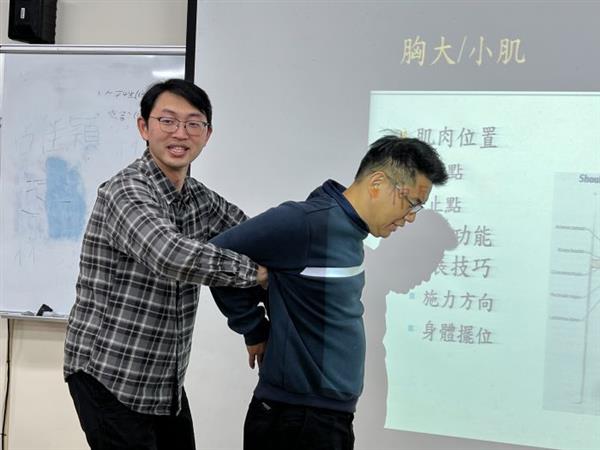 随后,由国立体育大学体育保健系张维纲专任副教授讲解「保护网球伤害」,虽然网球很少发生身体碰撞,但很容易产生非接触性伤害。张维纲先生特别解释了急性伤害和慢性伤害之间的区别以及预防措施以及原发性伤害和次发性伤害之间的区别,并为学生复习了急性期使用的P.R.I.C.E.守则,Protection(保护)、Rest(休息)、Ice(冰敷)、Compression(压迫)、Elevation(抬起),最后在课堂结束时带领学生分组学习如何伸展和收集练习。