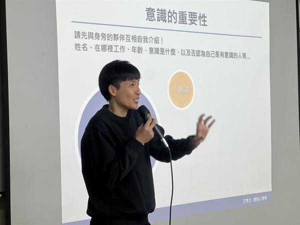 今天的第一堂课由逢甲大学王亭文教授讲解「运动心理学」,第一个问题在课程开始时就被抛出:「何谓意识?」让学生互相讨论,互相了解,然后让学生冥想并回答四个问题,包括他们的发型和衣服,以确认他们是否是有意识的人?还是你的生活意识太弱,需要加强?王亭文教授认为,有意识的生活非常重要。一个好的教练应该引导球员让他的大脑清晰而有意识!