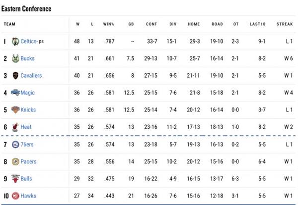 NBA 2023-2024 目前常规赛程已经过去了四分之三,东西区的季后赛也越来越激烈。截至截止日期,东区第四至东区第八只有1.5场胜差。原来,Joel Embid以Tyresesese打出史诗般的表演和破茧而出。 Maxey带领费城76人稳居前三,但随着Embid的受伤,76人的战绩也随之下降;纽约尼克也出现了类似的情况,随着Julis, Randle和OG Anunoby的伤退,使Tom Thibodeau教练已经紧缩的轮换更加紧张,他的记录也随着球队的健康而变红。尽管球员伤害了不断的士兵,迈阿密热火仍然依赖于Erik。 Spoelstra教练的运筹帷幄卡在了东区前6名。