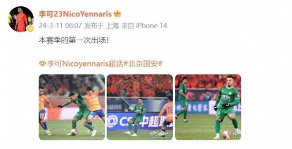 3月11日讯中超第二轮,北京国安客场0-0战平山东泰山。比赛结束后,国安队的归化球员李可更新了自己的社交媒体账号。
