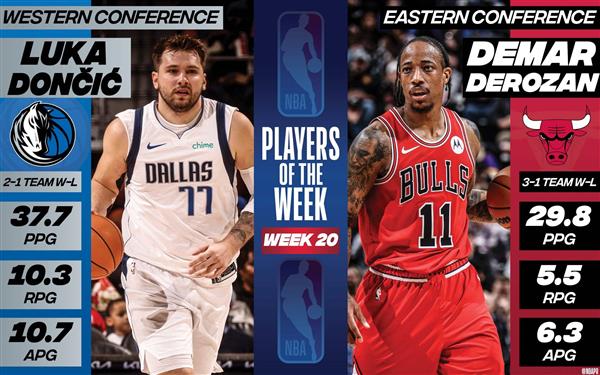 据北京时间3月12日消息,NBA正式宣布,上周东西部最佳球员是公牛的德马尔-德罗赞和独行侠卢卡-东契奇。