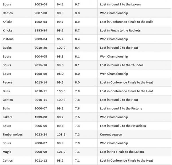 灰狼不仅仅拥有顶级防守,从数据面来看,他们也是过去40个赛季中最具支配力的球队。