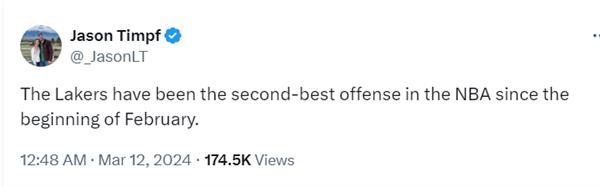 自1月24日以来,湖人队的场均得分为122.6分(联盟第一);詹姆斯场均贡献26.6分和9.4次助攻(也就是说,随着勒布朗年龄增长至39岁后,他的得分和助攻仍在增加,湖人队的进攻也呈现数量级的增长)。