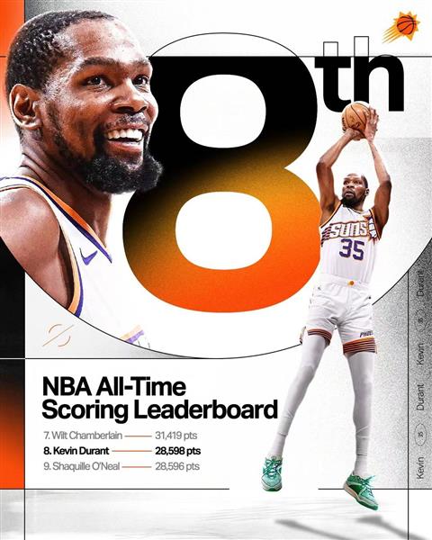 在这场比赛中,太阳队的明星球员杜兰特上场35分钟,得到了22分8个篮板和4次助攻。到目前为止,杜兰特的职业生涯总分超过了奥尼尔(28596分),在历史上排名第八!