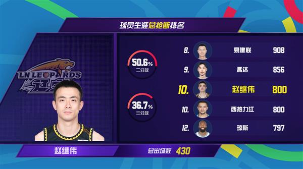 赵继伟的CBA联赛生涯始于2013-2014赛季,2013年11月27日,他在与山东金狮的比赛中完成了第一次抢断。赵继伟在2021年4月6日完成了个人第500次抢断。在这一轮之前,赵继伟的抢断总数是799次,加上这场比赛的一次抢断,正好是800次。这样,他的抢断总数也上升到了历史第十(与西热力江并列)。值得注意的是,赵继伟仍然是唯一一名助攻(2273次第六名)和抢断前十名的球员。