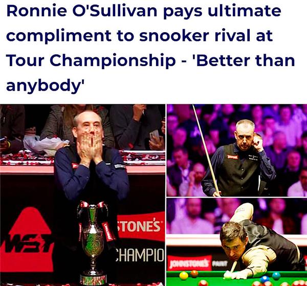 他说:“罗伯逊打得很吃惊,但当马克出来的时候,声音就像是从天而降。这一击非常精彩,我认为,马克·威廉姆斯是我见过最有天赋的斯诺克选手。我认为他的勇气,他的斯诺克思维和他的技术可能和吉米怀特一样。奥沙利文称赞老对手道。