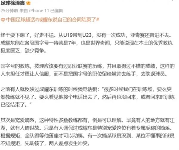 出现了一个巧合,不仅潘伟力对成耀东表示了不满,还有另一位媒体人通过社交媒体揭露了成耀东和国奥队的丑闻。徐泽鑫在社交媒体上爆料称,成耀东在国奥队的平时训练中经常消失不见;更令人匪夷所思的是,国奥队中有球员在队内摆架子,制定自己的规矩,全队必须等待他落座后才能动筷。曾经有一次这名球员迟到了,另一名队员不耐烦,破坏了规矩,率先动筷,导致两人险些发生冲突。