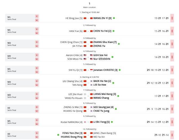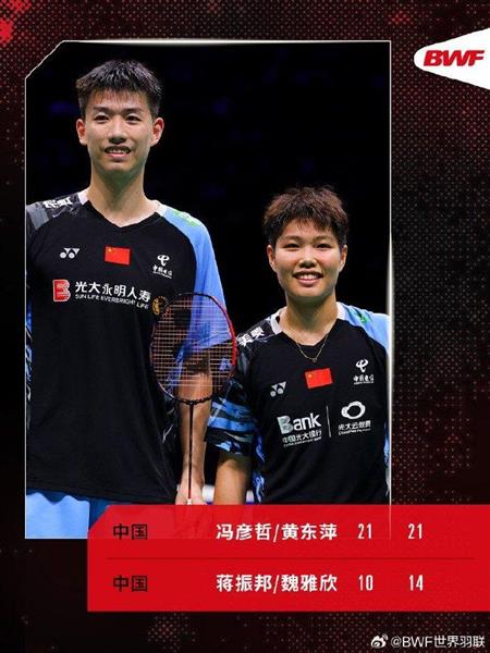 在混双比赛中,首位种子选手郑思维和黄雅琼耗时58分钟,打满三局。他们在先胜一局的情况下,却连续输掉两局,最终以1-2(21-9/13-21/16-21)不敌四号种子、韩国组合徐承宰和蔡宥玎,无缘决赛。在国羽内战的另一场比赛中,三号种子冯彦哲和黄东萍仅用时30分钟,就以2-0(21-10/21-14)横扫五号种子蒋振邦和魏雅欣,成功晋级决赛。于是,“凤凰组合”将会与“菜丁组合”争夺冠军。
