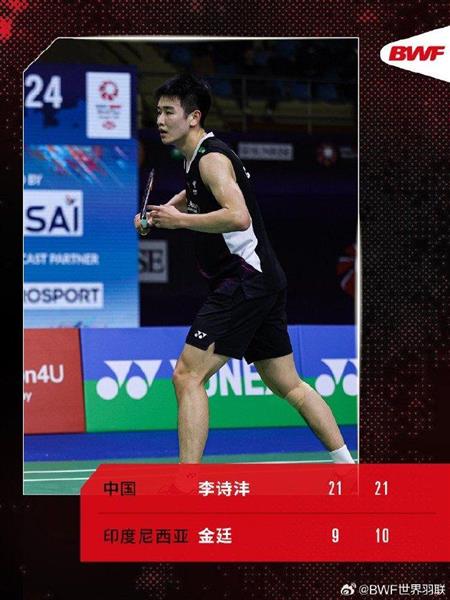 在晚间剩余的比赛中,中国羽毛球队再次赢得了6场比赛。在男子单打方面,第五号种子选手李诗沣只用了41分钟的时间,连胜两局,以2-0(21-9/21-10)击败印尼选手金廷,成功晋级到四强。