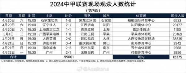 2024中甲联赛现场观众人数统计(第7轮)(补赛后,全)