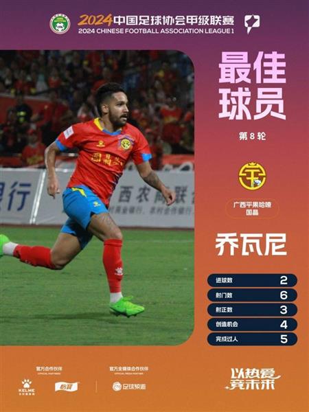 5月1日消息,广西平果哈嘹队在中甲联赛第8轮中以2-1击败了佛山南狮队,广西队的外援乔瓦尼在这场比赛中攻入了两个进球。在中超官方最佳球员评选中,乔瓦尼在专家评审环节中获得了7张第一顺位选票,最终以98分当选。