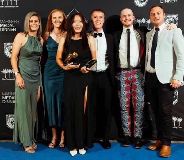 乌日古木拉参加晚宴时穿上了一套晚礼服,展现了她娴静端庄的形象,和平时在中央海岸水手女足比赛时的英姿截然不同。