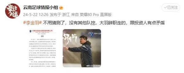 网络博主“云南足球情报小组”表示:“无需再猜测,并非其他球队对其挖角,是因为大羽辞职离开,可能与投资方产生了一些分歧。”