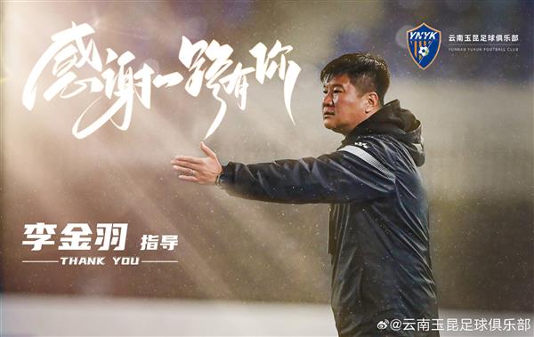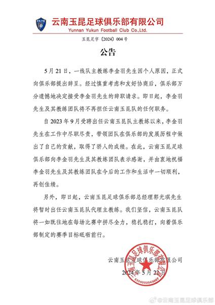 5月22日消息,中甲榜首球队云南玉昆宣布,李金羽已经辞去主教练职务。
