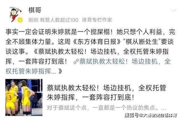 “中国女排击败泰国后,球队内部可能会在24小时内出现问题。蔡斌不能故意阻止朱婷为了个人声誉而上场。因此,我怀疑是一个人的个人原因影响了球队的团结。”