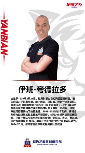 延边龙鼎官方写道:“祝贺伊班-夸德拉多先生正式成为延边的新主教练!在这个重要的时刻,我们期待着球队的未来。你的到来给我们带来了新的希望和愿景。
