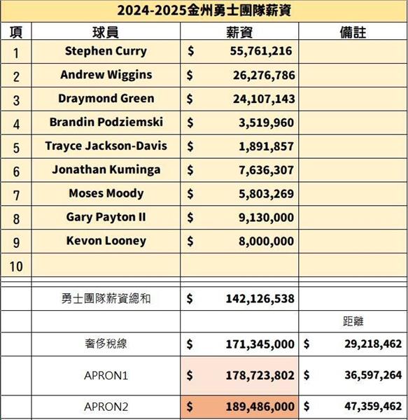 因此,如图所示,勇士明年有9名球员获得保证工资,总工资为142M。已经确定超过团队工资上限的141M不可能进行任何裸签FA。