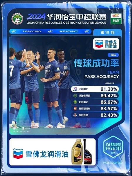 中超联赛官方公布了第18轮比赛的传球成功率排名,申花在主场6-0大胜泰山队的比赛中,传球成功率高达91.20%,位居本轮榜首。