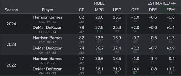简单检视 dunks&threes 的 EPM 这次交易的两个主角 Harrison Barnes 和 DeMar DeRozan 粗略的比较(是的,不用担心。 Chris Duarte)。