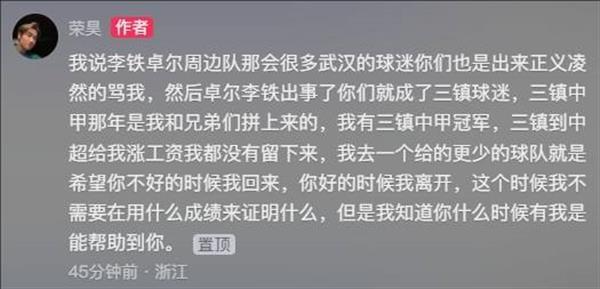 荣昊表示:我曾提到李铁和卓尔周边球队时,许多武汉球迷都是义正言辞地指责我,后来卓尔和李铁发生了问题,你们就变成了三镇的球迷。