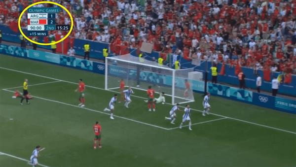 这种超长的补时对于落后的球队无疑是一个机会!果然,阿根廷队没有辜负期望,在第105分钟324秒时再次进球(见下图),顽强地追平了摩洛哥队。