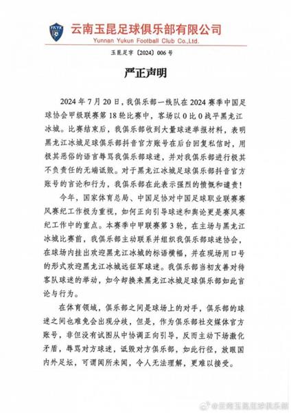 7月23日讯在辽宁铁人俱乐部之后,云南玉昆俱乐部针对黑龙江冰城俱乐部官方账号回复私信时侮辱云南玉昆球迷的行为,发表了正式声明。